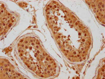 IHC image of CSB-PA871395LA01HU diluted at 1:640 and staining in paraffin-embedded human testis tissue performed on a Leica BondTM system. After dewaxing and hydration, antigen retrieval was mediated by high pressure in a citrate buffer (pH 6.0). Section was blocked with 10% normal goat serum 30min at RT. Then primary antibody (1% BSA) was incubated at 4°C overnight. The primary is detected by a biotinylated secondary antibody and visualized using an HRP conjugated SP system.