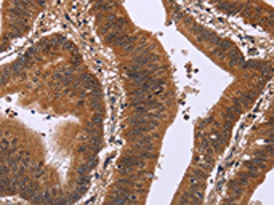 The image on the left is immunohistochemistry of paraffin-embedded Human colon cancer tissue using CSB-PA196180(DCBLD2 Antibody) at dilution 1/50, on the right is treated with fusion protein. (Original magnification: ×200)