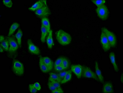 Immunofluorescence staining of HepG2 cells with CSB-PA023625LA01HU at 1:66, counter-stained with DAPI. The cells were fixed in 4% formaldehyde, permeabilized using 0.2% Triton X-100 and blocked in 10% normal Goat Serum. The cells were then incubated with the antibody overnight at 4°C. The secondary antibody was Alexa Fluor 488-congugated AffiniPure Goat Anti-Rabbit IgG(H+L).