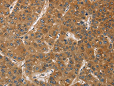 The image on the left is immunohistochemistry of paraffin-embedded Human liver cancer tissue using CSB-PA038642(DCTN1 Antibody) at dilution 1/60, on the right is treated with fusion protein. (Original magnification: ×200)