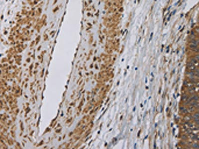 The image on the left is immunohistochemistry of paraffin-embedded Human cervical cancer tissue using CSB-PA921442(DCTN3 Antibody) at dilution 1/50, on the right is treated with fusion protein. (Original magnification: ×200)