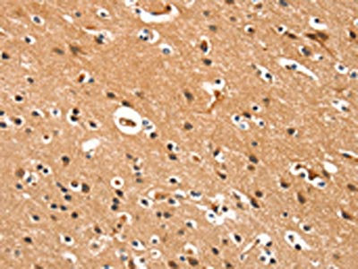 The image on the left is immunohistochemistry of paraffin-embedded Human brain tissue using CSB-PA936982(DDAH2 Antibody) at dilution 1/15, on the right is treated with synthetic peptide. (Original magnification: ×200)