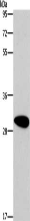 Gel: 10%SDS-PAGE, Lysate: 40 μg, Lane: Human fetal brain tissue, Primary antibody: CSB-PA936982(DDAH2 Antibody) at dilution 1/300, Secondary antibody: Goat anti rabbit IgG at 1/8000 dilution, Exposure time: 30 seconds