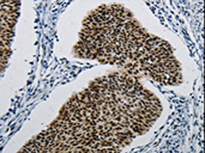 The image on the left is immunohistochemistry of paraffin-embedded Human cervical cancer tissue using CSB-PA056628(DDB1 Antibody) at dilution 1/5, on the right is treated with synthetic peptide. (Original magnification: ×200)