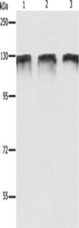 Gel: 8%SDS-PAGE, Lysate: 40 μg, Lane 1-3: MCF7 cells, Hela cells, HepG2 cells, Primary antibody: CSB-PA056628(DDB1 Antibody) at dilution 1/350, Secondary antibody: Goat anti rabbit IgG at 1/8000 dilution, Exposure time: 1 minute