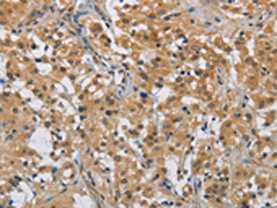 The image on the left is immunohistochemistry of paraffin-embedded Human thyroid cancer tissue using CSB-PA994119(DDX43 Antibody) at dilution 1/50, on the right is treated with fusion protein. (Original magnification: ×200)