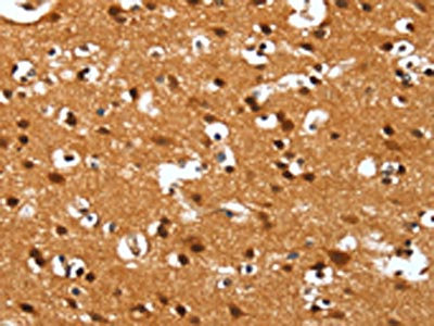 The image on the left is immunohistochemistry of paraffin-embedded Human brain tissue using CSB-PA761300(DEFA4 Antibody) at dilution 1/40, on the right is treated with synthetic peptide. (Original magnification: ×200)