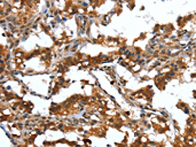 The image on the left is immunohistochemistry of paraffin-embedded Human thyroid cancer tissue using CSB-PA761300(DEFA4 Antibody) at dilution 1/40, on the right is treated with synthetic peptide. (Original magnification: ×200)