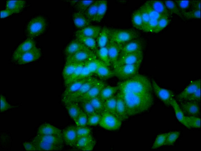 Immunofluorescence staining of HepG2 cells with CSB-PA865135LA01HU at 1:133, counter-stained with DAPI. The cells were fixed in 4% formaldehyde, permeabilized using 0.2% Triton X-100 and blocked in 10% normal Goat Serum. The cells were then incubated with the antibody overnight at 4°C. The secondary antibody was Alexa Fluor 488-congugated AffiniPure Goat Anti-Rabbit IgG(H+L).