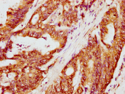 IHC image of CSB-PA004729LA01HU diluted at 1:300 and staining in paraffin-embedded human colon cancer performed on a Leica BondTM system. After dewaxing and hydration, antigen retrieval was mediated by high pressure in a citrate buffer (pH 6.0). Section was blocked with 10% normal goat serum 30min at RT. Then primary antibody (1% BSA) was incubated at 4°C overnight. The primary is detected by a biotinylated secondary antibody and visualized using an HRP conjugated SP system.