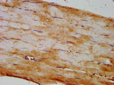 IHC image of CSB-PA821705LA01HU diluted at 1:400 and staining in paraffin-embedded human skeletal muscle tissue performed on a Leica BondTM system. After dewaxing and hydration, antigen retrieval was mediated by high pressure in a citrate buffer (pH 6.0). Section was blocked with 10% normal goat serum 30min at RT. Then primary antibody (1% BSA) was incubated at 4°C overnight. The primary is detected by a biotinylated secondary antibody and visualized using an HRP conjugated SP system.