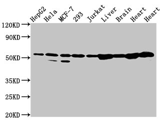Positive WB detected in: HepG2 whole cell lysate, Hela whole cell lysate, MCF-7 whole cell lysate, 293 whole cell lysate, Jurkat whole cell lysate, Rat liver tissue, Rat brain tissue, Rat heart tissue, Mouse heart tissue