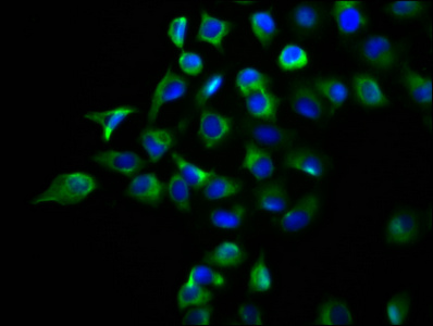 Immunofluorescence staining of A549 cells with CSB-PA757514LA01HU at 1:133, counter-stained with DAPI. The cells were fixed in 4% formaldehyde, permeabilized using 0.2% Triton X-100 and blocked in 10% normal Goat Serum. The cells were then incubated with the antibody overnight at 4°C. The secondary antibody was Alexa Fluor 488-congugated AffiniPure Goat Anti-Rabbit IgG(H+L).