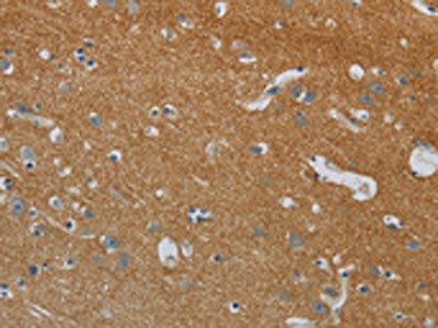 The image on the left is immunohistochemistry of paraffin-embedded Human brain tissue using CSB-PA780265(DPYSL3 Antibody) at dilution 1/20, on the right is treated with synthetic peptide. (Original magnification: ×200)