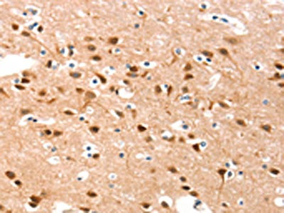 The image on the left is immunohistochemistry of paraffin-embedded Human brain tissue using CSB-PA046723(DSC1 Antibody) at dilution 1/40, on the right is treated with synthetic peptide. (Original magnification: ×200)