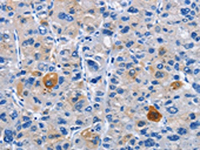 The image on the left is immunohistochemistry of paraffin-embedded Human liver cancer tissue using CSB-PA157953(DUSP19 Antibody) at dilution 1/30, on the right is treated with fusion protein. (Original magnification: ×200)