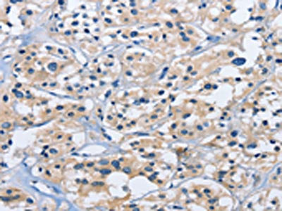 The image on the left is immunohistochemistry of paraffin-embedded Human thyroid cancer tissue using CSB-PA157953(DUSP19 Antibody) at dilution 1/30, on the right is treated with fusion protein. (Original magnification: ×200)
