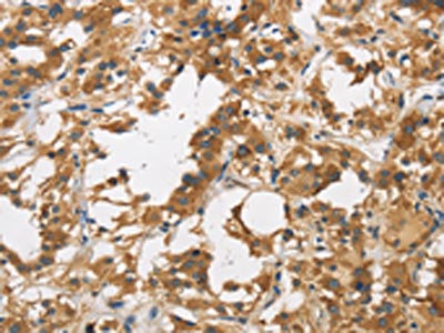 The image on the left is immunohistochemistry of paraffin-embedded Human thyroid cancer tissue using CSB-PA571416(DUSP23 Antibody) at dilution 1/30, on the right is treated with fusion protein. (Original magnification: ×200)