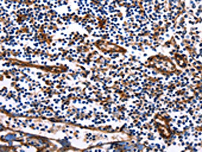 The image on the left is immunohistochemistry of paraffin-embedded Human tonsil tissue using CSB-PA625538(DUSP6 Antibody) at dilution 1/25, on the right is treated with fusion protein. (Original magnification: ×200)