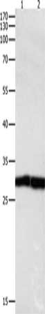 Gel: 10%SDS-PAGE, Lysate: 30 μg, Lane 1-2: Jurkat cells, human fetal kidney tissue, Primary antibody: CSB-PA625538(DUSP6 Antibody) at dilution 1/450, Secondary antibody: Goat anti rabbit IgG at 1/8000 dilution, Exposure time: 1 minute