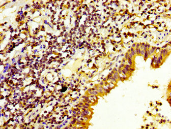 IHC image of CSB-PA621973LA01HU diluted at 1:200 and staining in paraffin-embedded human lung cancer performed on a Leica BondTM system. After dewaxing and hydration, antigen retrieval was mediated by high pressure in a citrate buffer (pH 6.0). Section was blocked with 10% normal goat serum 30min at RT. Then primary antibody (1% BSA) was incubated at 4°C overnight. The primary is detected by a biotinylated secondary antibody and visualized using an HRP conjugated SP system.