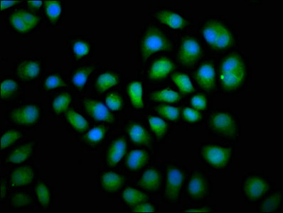 Immunofluorescence staining of Hela cells with CSB-PA621973LA01HU at 1:66, counter-stained with DAPI. The cells were fixed in 4% formaldehyde, permeabilized using 0.2% Triton X-100 and blocked in 10% normal Goat Serum. The cells were then incubated with the antibody overnight at 4°C. The secondary antibody was Alexa Fluor 488-congugated AffiniPure Goat Anti-Rabbit IgG(H+L).