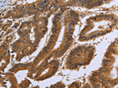 The image on the left is immunohistochemistry of paraffin-embedded Human colon cancer tissue using CSB-PA953662(DUSP8 Antibody) at dilution 1/30, on the right is treated with synthetic peptide. (Original magnification: ×200)