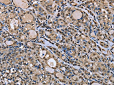 The image on the left is immunohistochemistry of paraffin-embedded Human thyroid cancer tissue using CSB-PA244606(DYNLL1 Antibody) at dilution 1/30, on the right is treated with fusion protein. (Original magnification: ×200)
