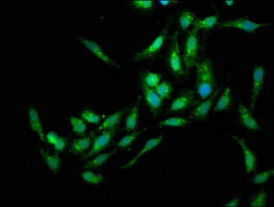 Immunofluorescence staining of Hela cells with CSB-PA744034LA01HU at 1:133, counter-stained with DAPI. The cells were fixed in 4% formaldehyde, permeabilized using 0.2% Triton X-100 and blocked in 10% normal Goat Serum. The cells were then incubated with the antibody overnight at 4°C. The secondary antibody was Alexa Fluor 488-congugated AffiniPure Goat Anti-Rabbit IgG(H+L).