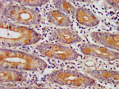 IHC image of CSB-PA744034LA01HU diluted at 1:400 and staining in paraffin-embedded human small intestine tissue performed on a Leica BondTM system. After dewaxing and hydration, antigen retrieval was mediated by high pressure in a citrate buffer (pH 6.0). Section was blocked with 10% normal goat serum 30min at RT. Then primary antibody (1% BSA) was incubated at 4°C overnight. The primary is detected by a biotinylated secondary antibody and visualized using an HRP conjugated SP system.