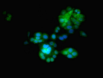 Immunofluorescent analysis of PC-3 cells using CSB-PA007482EA01HU at dilution of 1:100 and Alexa Fluor 488-congugated AffiniPure Goat Anti-Rabbit IgG(H+L)