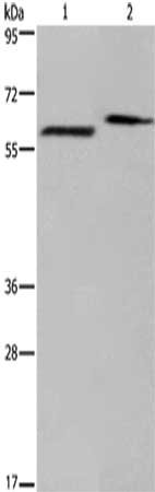 Gel: 6%SDS-PAGE,Lysate: 40 μg,Lane 1-2: Human fetal brain tissue, Mouse brain tissue,Primary antibody: CSB-PA205879(EGR4 Antibody) at dilution 1/400 dilution,Secondary antibody: Goat anti rabbit IgG at 1/8000 dilution,Exposure time: 2 minutes