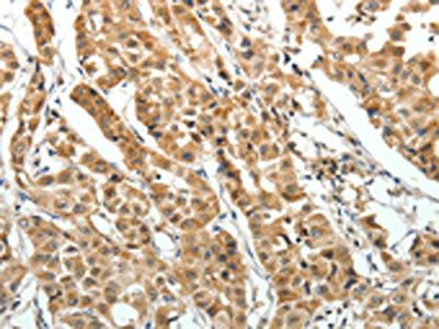 The image on the left is immunohistochemistry of paraffin-embedded Human liver cancer tissue using CSB-PA071225(EIF2AK3 Antibody) at dilution 1/30, on the right is treated with fusion protein. (Original magnification: ×200)
