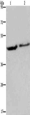 Gel: 8%SDS-PAGE, Lysate: 40 μg, Lane 1-2: Human adrenal pheochromocytoma tissue, Human fetal brain tissue, Primary antibody: CSB-PA903985(EIF3H Antibody) at dilution 1/1150, Secondary antibody: Goat anti rabbit IgG at 1/8000 dilution, Exposure time: 40 seconds