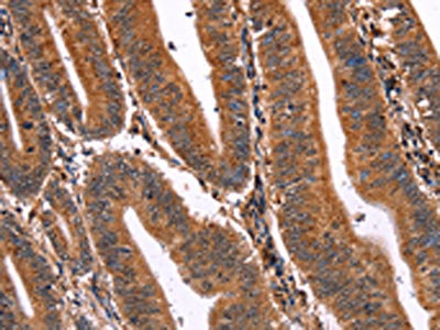 The image on the left is immunohistochemistry of paraffin-embedded Human colon cancer tissue using CSB-PA276963(ELP2 Antibody) at dilution 1/40, on the right is treated with fusion protein. (Original magnification: ×200)