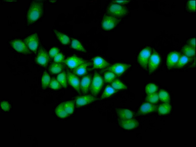 Immunofluorescence staining of Hela cells with CSB-PA740224LA01HU at 1:166, counter-stained with DAPI. The cells were fixed in 4% formaldehyde, permeabilized using 0.2% Triton X-100 and blocked in 10% normal Goat Serum. The cells were then incubated with the antibody overnight at 4°C. The secondary antibody was Alexa Fluor 488-congugated AffiniPure Goat Anti-Rabbit IgG(H+L).