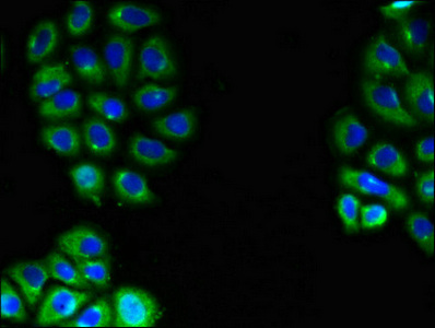Immunofluorescent analysis of A549 cells using CSB-PA754239LA01HU at dilution of 1:100 and Alexa Fluor 488-congugated AffiniPure Goat Anti-Rabbit IgG(H+L)