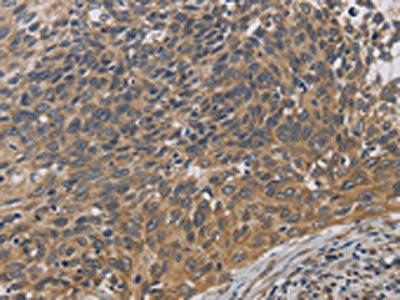 The image on the left is immunohistochemistry of paraffin-embedded Human cervical cancer tissue using CSB-PA276232(EMC8 Antibody) at dilution 1/30, on the right is treated with fusion protein. (Original magnification: ×200)