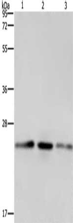 Gel: 10%SDS-PAGE, Lysate: 40 μg, Lane 1-3: A549 cells, Hela cells, HT29 cells, Primary antibody: CSB-PA276232(EMC8 Antibody) at dilution 1/600, Secondary antibody: Goat anti rabbit IgG at 1/8000 dilution, Exposure time: 1 minute