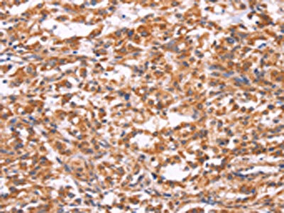 The image on the left is immunohistochemistry of paraffin-embedded Human thyroid cancer tissue using CSB-PA447792(EMP2 Antibody) at dilution 1/30, on the right is treated with synthetic peptide. (Original magnification: ×200)
