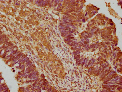 IHC image of CSB-PA744265OA01HU diluted at 1:200 and staining in paraffin-embedded human ovarian cancer performed on a Leica BondTM system. After dewaxing and hydration, antigen retrieval was mediated by high pressure in a citrate buffer (pH 6.0). Section was blocked with 10% normal goat serum 30min at RT. Then primary antibody (1% BSA) was incubated at 4°C overnight. The primary is detected by a biotinylated secondary antibody and visualized using an HRP conjugated SP system.