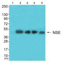 Western blot analysis of extracts from Hela cells (Lane 2), colo cells(Lane 3)lbnotHepG2 cells(Lane 4) and 293 cells (Lane 5), using NSE antiobdy. The lane on the left is treated with synthesized peptide.