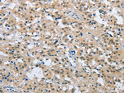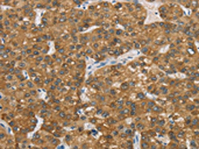 The image on the left is immunohistochemistry of paraffin-embedded Human liver cancer tissue using CSB-PA929748(ENTPD5 Antibody) at dilution 1/20, on the right is treated with fusion protein. (Original magnification: ×200)