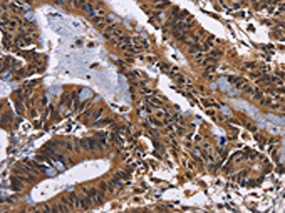 The image on the left is immunohistochemistry of paraffin-embedded Human colon cancer tissue using CSB-PA063633(EPHB6 Antibody) at dilution 1/50, on the right is treated with fusion protein. (Original magnification: ×200)