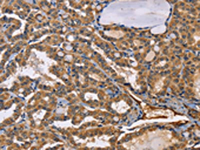 The image on the left is immunohistochemistry of paraffin-embedded Human thyroid cancer tissue using CSB-PA063633(EPHB6 Antibody) at dilution 1/50, on the right is treated with fusion protein. (Original magnification: ×200)