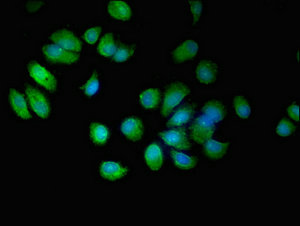 Immunofluorescent analysis of MCF-7 cells using CSB-PA867130LA01HU at dilution of 1:100 and Alexa Fluor 488-congugated AffiniPure Goat Anti-Rabbit IgG(H+L)