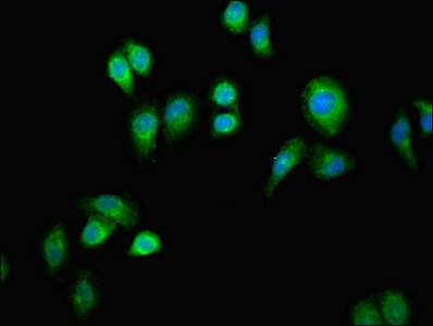 Immunofluorescent analysis of A549 cells using CSB-PA007759LA01HU at dilution of 1:100 and Alexa Fluor 488-congugated AffiniPure Goat Anti-Rabbit IgG(H+L)