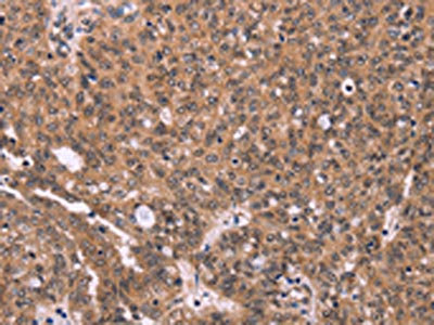The image on the left is immunohistochemistry of paraffin-embedded Human ovarian cancer tissue using CSB-PA699373(ERAS Antibody) at dilution 1/40, on the right is treated with synthetic peptide. (Original magnification: ×200)