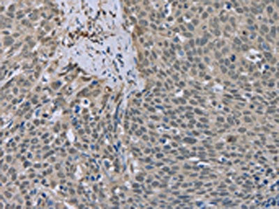 The image on the left is immunohistochemistry of paraffin-embedded Human cervical cancer tissue using CSB-PA912176(ESR2 Antibody) at dilution 1/20, on the right is treated with fusion protein. (Original magnification: ×200)