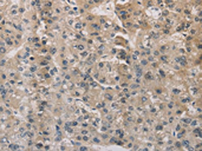 The image on the left is immunohistochemistry of paraffin-embedded Human liver cancer tissue using CSB-PA034482(ESRRG Antibody) at dilution 1/30, on the right is treated with fusion protein. (Original magnification: ×200)